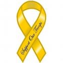 Cut 2 pieces of canvas 21x25 threads (20x24 holes) according to the pattern, don't forget to cut out the hole in the middle. Follow the pattern to stitch both pieces of the project, stitching the Continental stitch in yellow first. Then use the Medium Tangerine to embroider the lines shown in the pattern (to make it look like one side of the ribbon is overlapping the other side). Using the Dark Peacock Blue embroider the letters on both pieces. Once both pieces are completely stitched, whipstitch them together with the Medium Tangarine. Thread the Black Cord through the top of the ribbon to hang on your rear view window for all to see. You can also make this into a keychain.